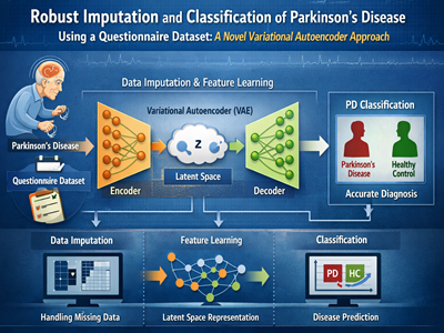 This study introduces a novel Fully Connected Variational Autoencoder (VICPute) to effectively address the challenges of missing data imputation and classification of Parkinson’s disease (PD) using the Parkinson’s Progression Markers Initiative (PPMI) dataset. The VICPute model, which integrates an encoder with dual decoders, refines imputation and classification processes through a pioneering architecture that employs computational blocks for enhanced feature extraction. This model distinguishes between healthy individuals and those with PD and robustly handles significant missing data issues within a complex dataset that includes 24,182 samples from 2,427 patients. Our approach optimizes training by applying advanced preprocessing techniques such as Multivariate Imputation by Chained Equations (MICE) and generating artificial missing data. The model’s efficiency is underscored by a high f1-score of 0.87 in testing, highlighting the potential of deep learning techniques to enhance diagnostic accuracy and contribute to the broader understanding of PD progression.